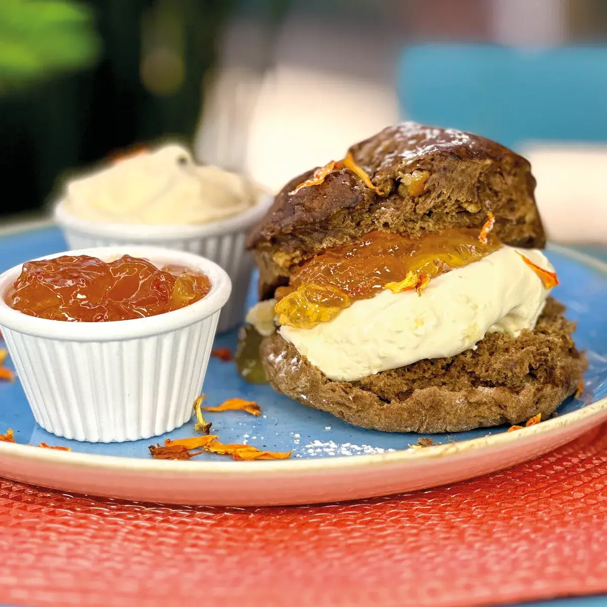 The North Coast Six is sharing platter that brings together six of our sweet mini scones – Coffee & Walnut, Ginger, Apple Crumble, Orange & Lemon, Cherry & Almond and Spiced Fruit – all served with generous helpings of clotted cream, strawberry jam, lemon curd and North Devon honey.